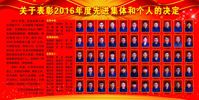 2016年度,在全體員工的共同努力下,公司取得了較好的業(yè)績:年銷售加工Φ8mm銅桿、各類規(guī)格裸銅線、鍍錫銅線、束絞銅線65.7萬噸,增長5%;2016年銷售收入超167億元。為表彰先進(jìn),推動工作,公司決定對在2016年度中取得顯著成績的各類先進(jìn)予以表彰。希望受到表彰的先進(jìn)個(gè)人,在新的一年里再接再厲,再創(chuàng)佳績。新的一年里,公司號召全體員工,以先進(jìn)為榜樣,踏實(shí)工作、努力創(chuàng)新,踐行工業(yè)理想,以客戶為中心,以品質(zhì)為根本,為創(chuàng)建國際一流銅加工企業(yè)而奮斗。優(yōu)秀中層:盧斌聲、楊愛民、殷 杰、施嘉、薛鋒、劉立明 萬志新、駱駿、朱培飛、蔣福良、駱品其 優(yōu)秀班組長:朱國新、駱康平、李 明、陳傳松、周 歡、莊立中 張益琴、劉 杰、王志超、王春龍 優(yōu)秀員工:朱洪星、蔣濤、高永新、陸蘇云、韓志同、史利超儲建明、楊明雨、宗健、戴玉龍、 高歡保、蔣黎明曹志彬、羅祖國、吳小強(qiáng)、何亞濱、宗曉萍、莊年芬李常龍、譚春香、楊榮波、趙江來、焦春花、唐后東 儲志敏、曾棟強(qiáng)、駱 波、吳燕、駱 靜、李方海 蔣銀飛、董麗娟、丁志兵、儲祥妹
