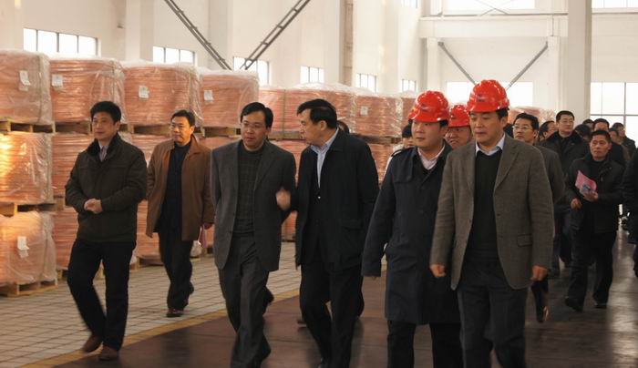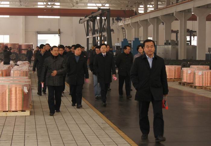 12月21日上午,在市長王中蘇的陪同下,寶應縣黨政代表團來公司參觀考察。總經理駱偉棟熱情接待了代表團一行,并介紹了公司的發(fā)展歷程和前景。代表團參觀了SCR銅桿車間、復合銅線車間、銅絞線車間。